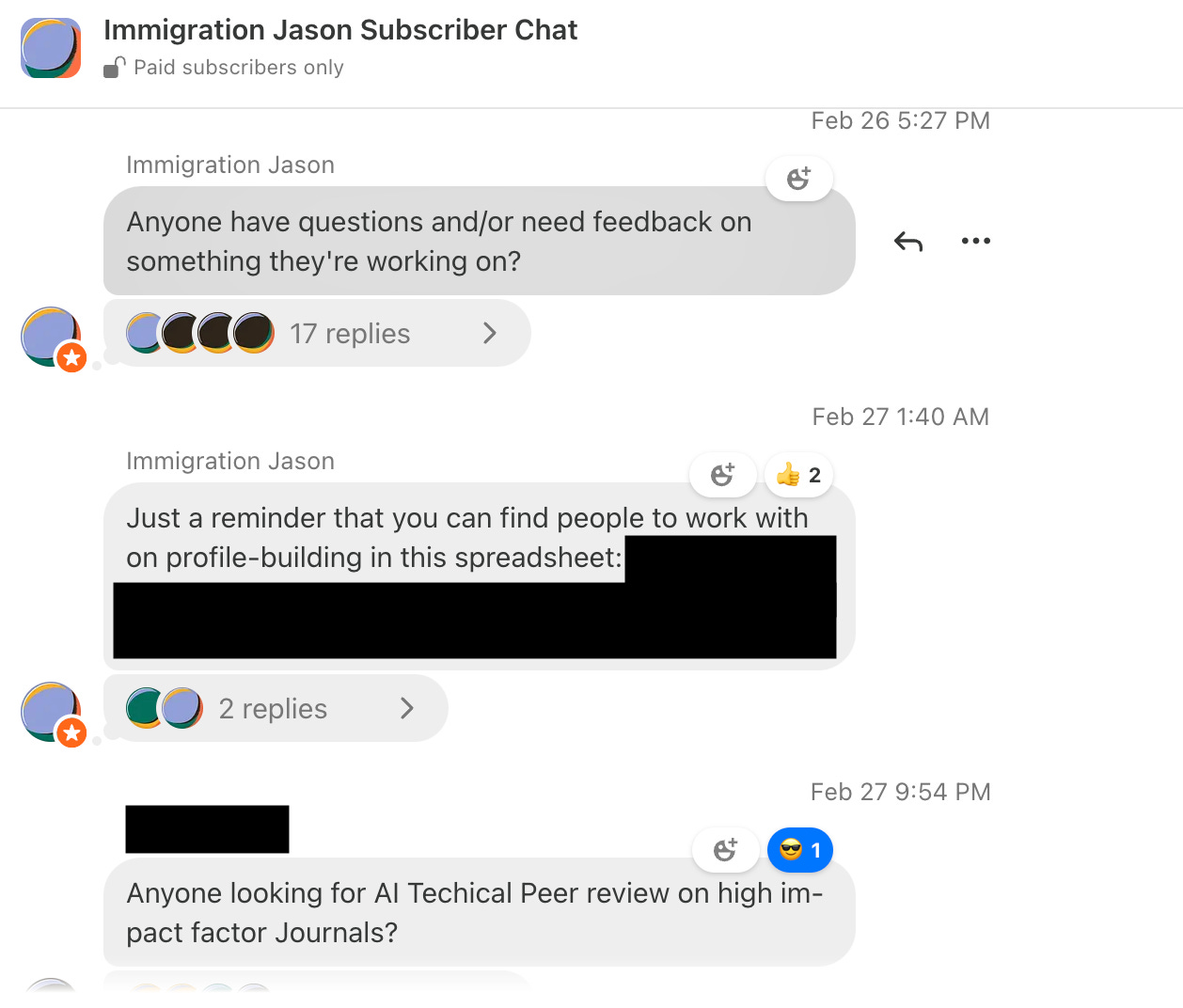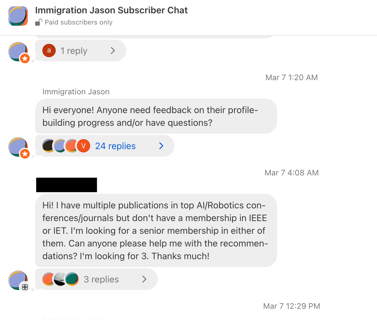 I have also been actively answering questions and reviewing profile-building progress in the newsletter’s group chat (see screenshot below) where members have been actively helping each other on EB-1A, EB-2 NIW, and O-1 profile-building.